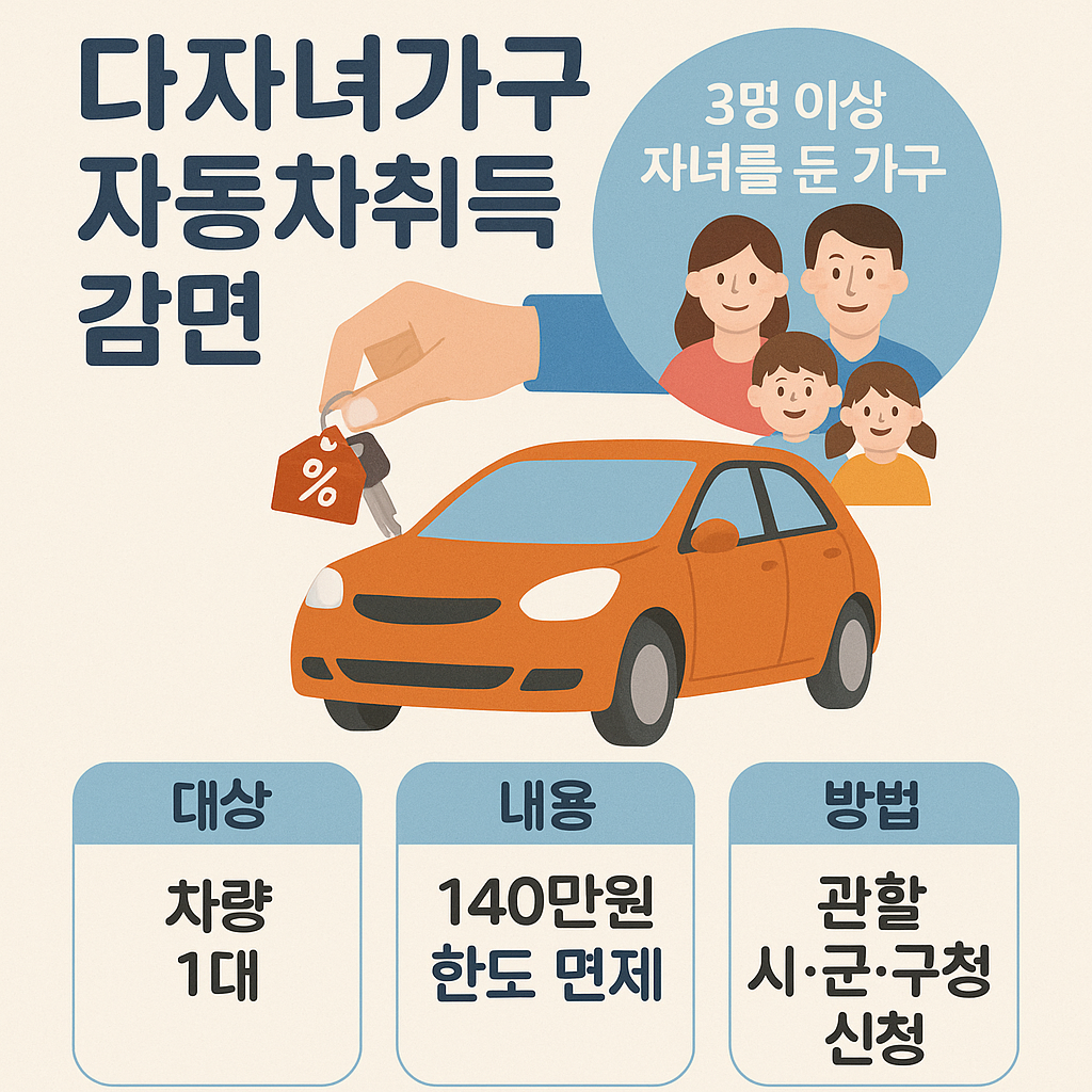 | 3자녀 이상 가구 | 승용자동차(6인 이하) | 취득세 전액 면제 (최대 140만원 한도) |